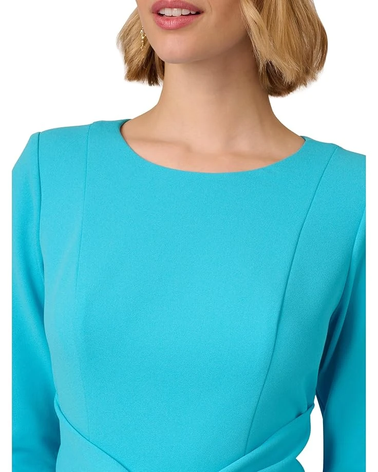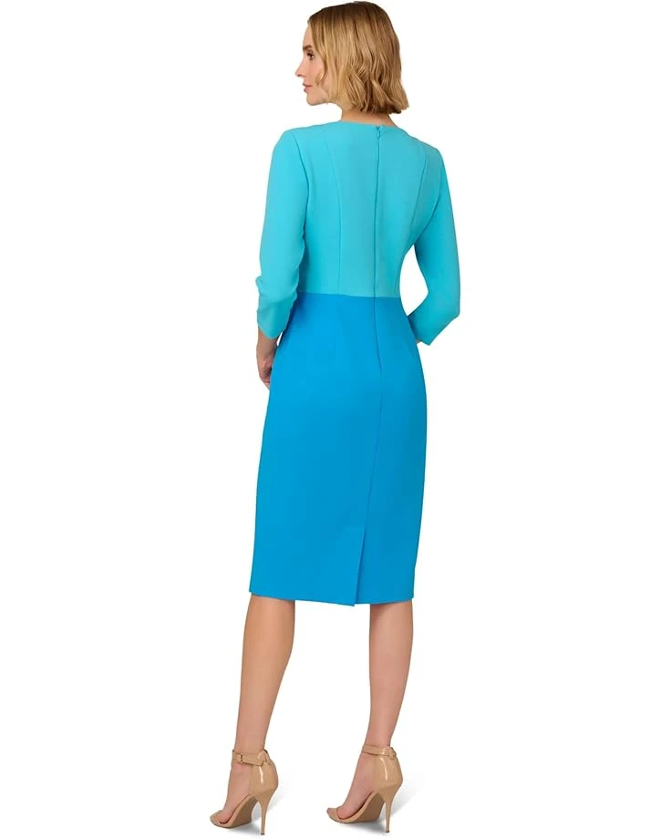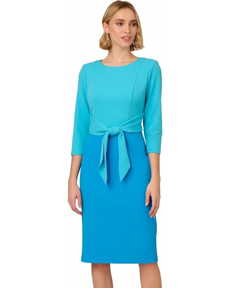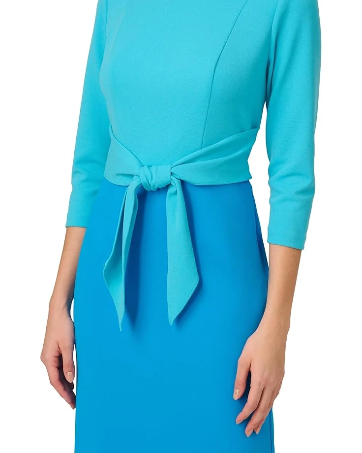 - From weddings, and dinner dates, to office events, the Adrianna Papell® Colorblock Tie Front Dress works for different occasions. The polyester blend fabric offers superior comfort and stretch. This fitted dress features a color-block detailing for a chic look while the tie closure at the front offers a flattering fit. The elbow-length sleeves and crew neckline add style and comfort. Walk with style and confidence by wearing this color-block dress.