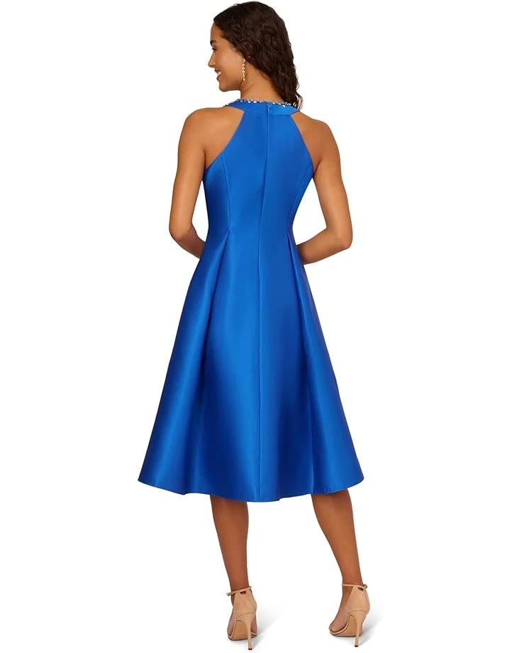 - Develop a fashionable connection with the world as you step out wearing the classic Adrianna Papell® Fit And Flare Stretch Mikado Party Dress with Beaded Neckline. It features a halter neckline with stone-applique embellishments, sleeveless construction, and flowy high-low hem. With a center back zippered closure, it has side on-seam pockets that offer additional ease.