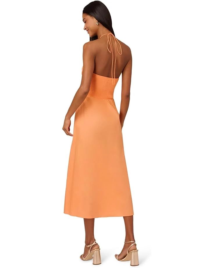 - Own your moment, make a lasting impression in the Adrianna Papell® Halter Shirred Midi Dress. This stunning piece features a chic halter neck and flattering blouson silhouette, offering effortless sophistication. Sleeveless design ensures comfort and style, while the zippered back closure provides a secure fit. Falling gracefully below the knee, it’s perfect for any occasion.