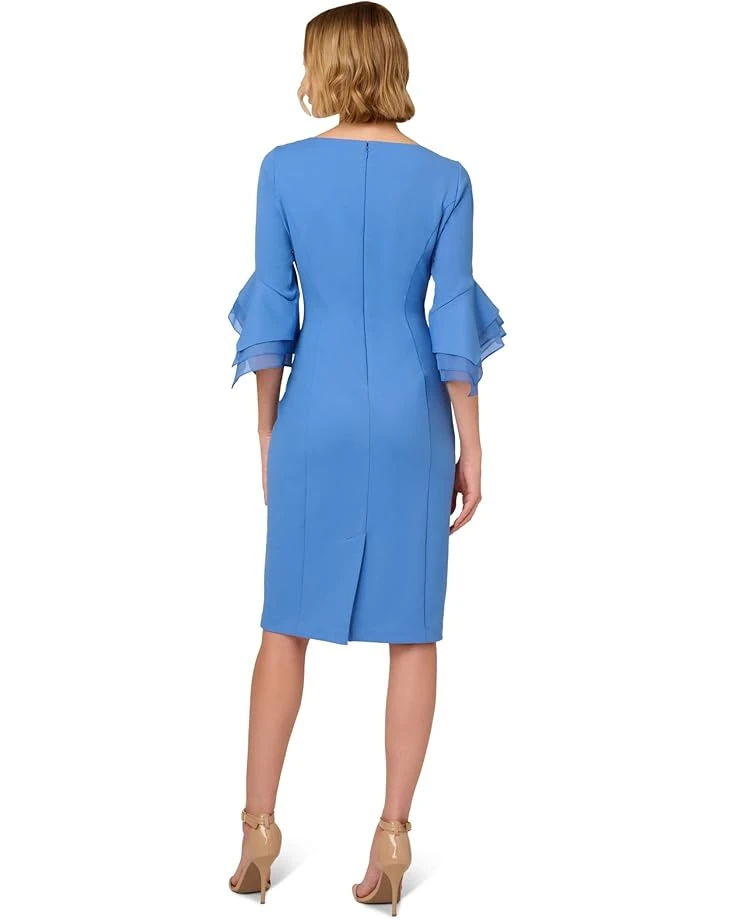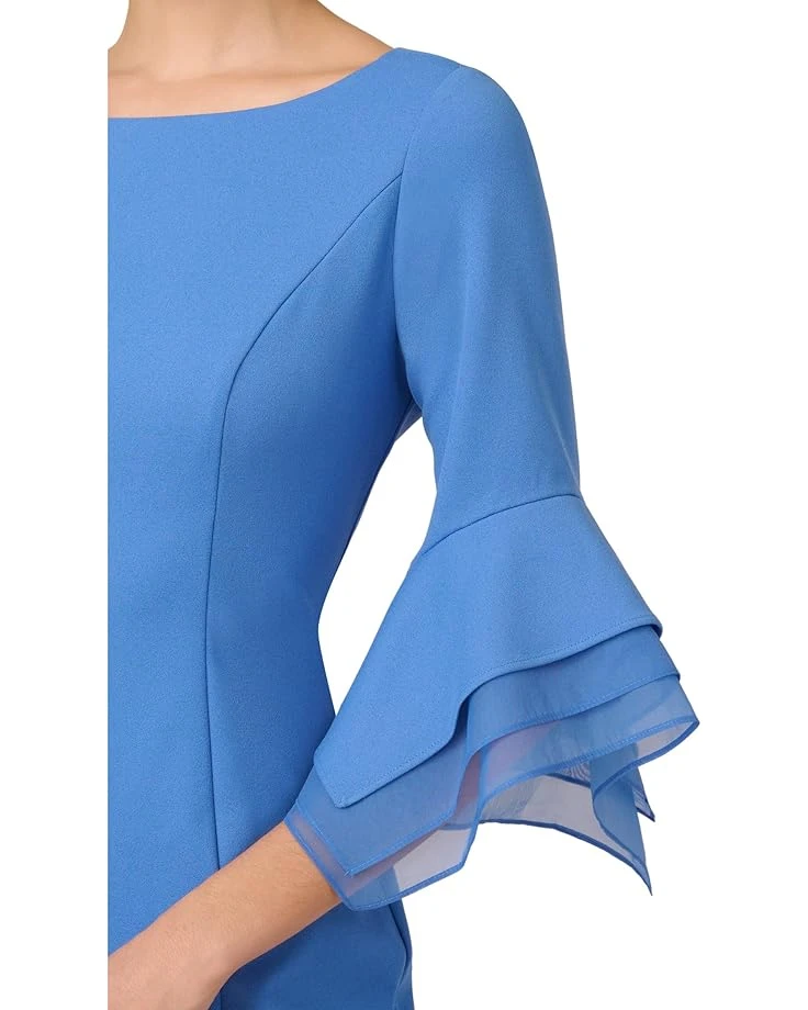 - Elegance redefined with the Adrianna Papell® Knit Crepe Tiered Sleeve Dress. Embrace timeless sophistication in this midi marvel with a boat neckline, fitted silhouette, and tiered bell sleeves. Crafted from knit crepe for comfort and stretch, featuring a zipper back closure, no waist seam, and a single pleat. Solid pattern, bow embellishment, quarter sleeves − redefine your style effortlessly.