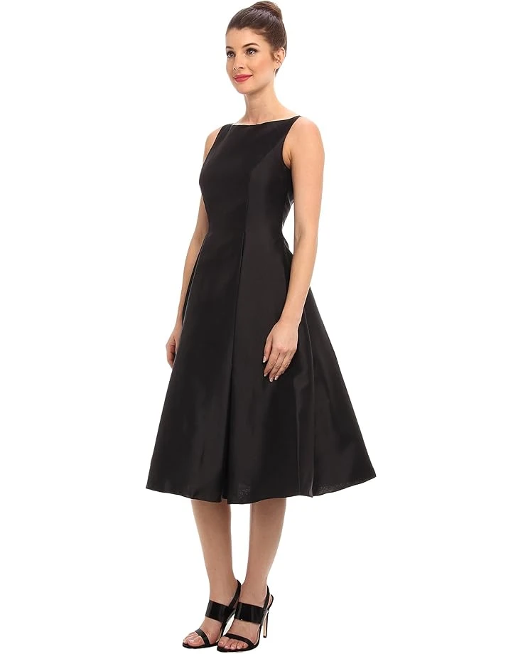 - Satin fit-and-flare dress features inverted pleats along the tea length skirt.