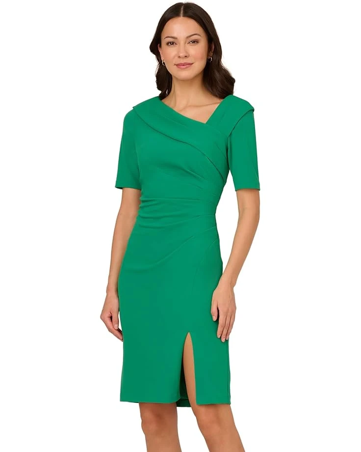 - Indulge in timeless sophistication adorning the Adrianna Papell® Stretch Crepe Dress. Embrace timeless sophistication in this classic sheath dress, featuring a chic asymmetrical neckline with pleated detailing and elbow-length sleeves for a touch of modern grace. The draped knit crepe fabric hugs your figure flawlessly, while the zippered back closure ensures a perfect fit. A stylish slit at the side of the midi-length skirt adds a hint of allure.