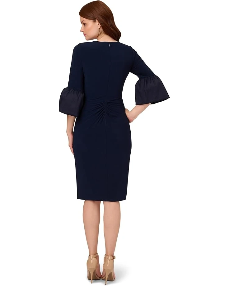 - Unleash your inner goddess in this ethereal Adrianna Papell® Stretch Jersey Twist Front Dress with Taffetta Bell Sleeve. This mid-length dress features a v-neckline, sheath silhouette, and three-quarter bell sleeves with luxe taffeta cuffs. Crafted from comfortable jersey fabric, this day dress has generous stretch and a figure-flattering twist front that drapes the figure.