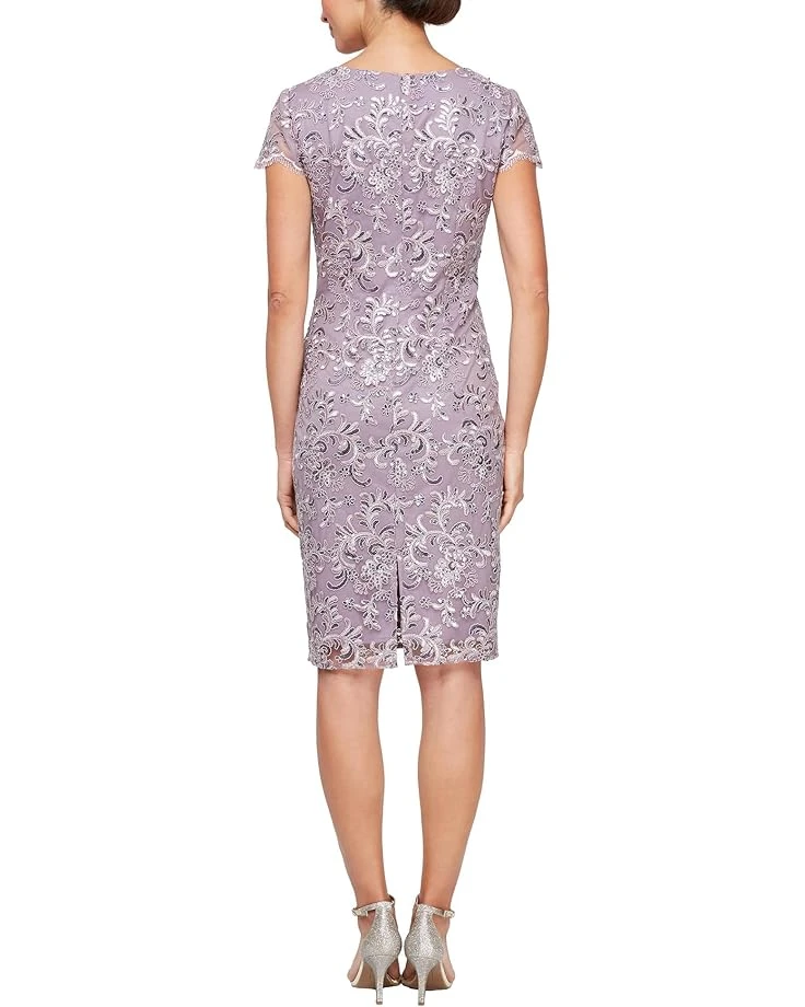 - Indulge in elegance with Alex Evenings™ Embroidered Sheath Dress − a canvas of sophistication. This short sheath dress boasts cap sleeves and a square neckline adorned with intricate embroidery, exuding timeless charm. The scallop trim adds a touch of allure, while the back zipper ensures easy wear.