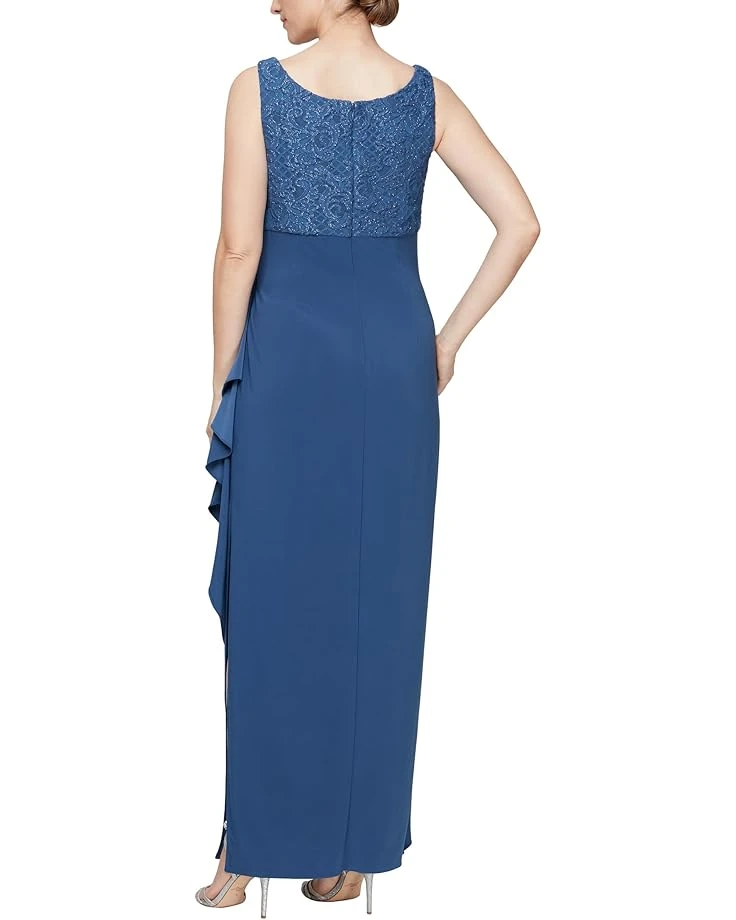 - Two-tone lace bodice complements the sleek poly skirt.