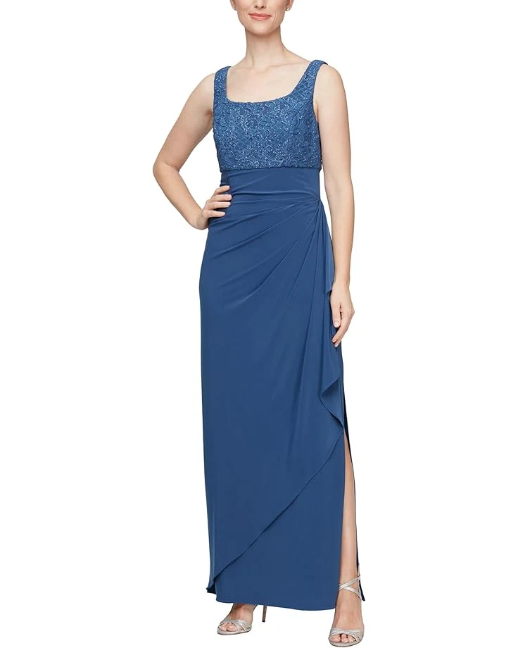 - Straight hemline falls at a floor-sweeping length.