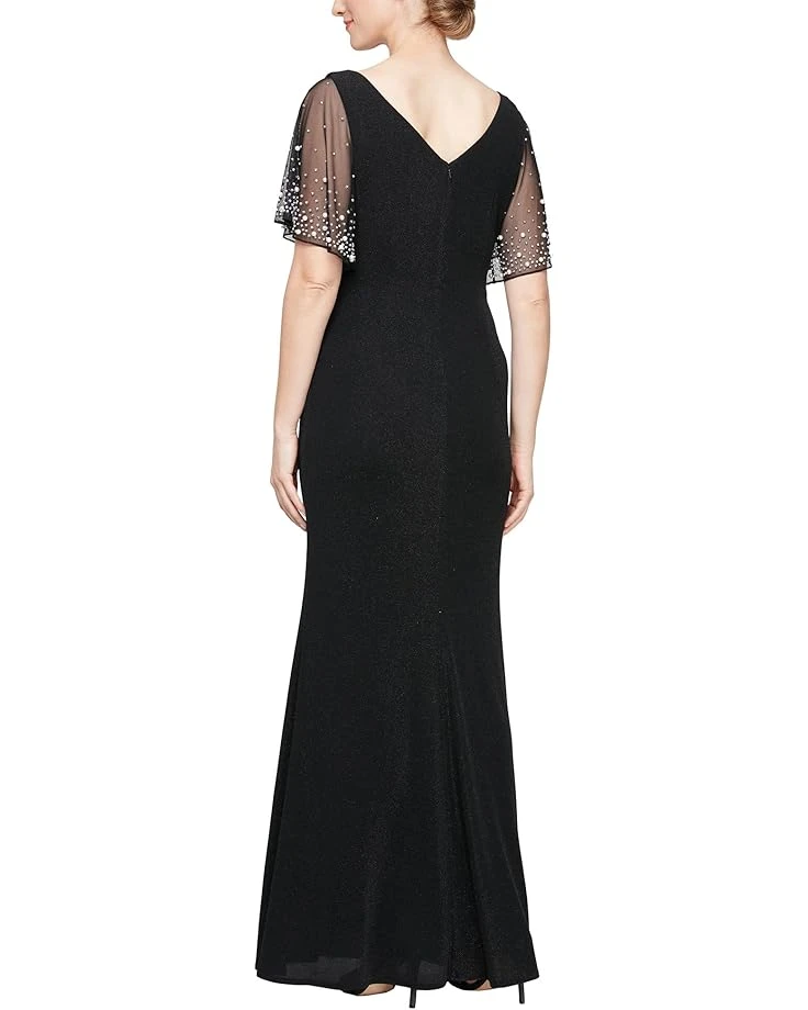 - Make a remarkable entry into any party or event by wearing the Alex Eveningsâ„¢ Long Metallic Knit Dress. The soft and stretchy metallic knit fabric of the dress ensures that you can comfortably move around. Its zippered back closure offers easy on and off. This long dress features a ruched detailing at the waist that offers a flattering fit. Become the talk of the party by wearing this gorgeous maxi dress.