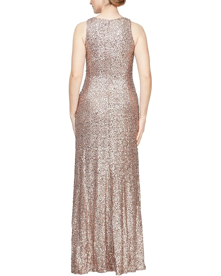 - Unleash your inner glam wearing the Alex Eveningsâ„¢ Long Sequins Dress with Cascade Ruffle. This floor-length dress features scoop neckline, zippered back closure for a chic look.
