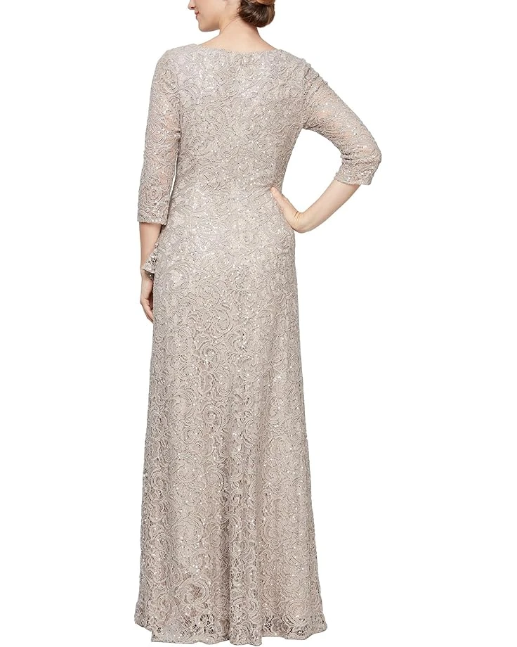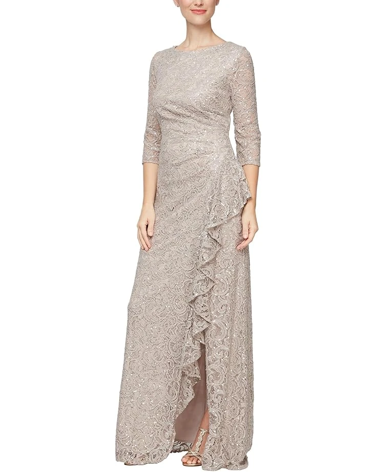 - Step into elegance with the Alex Eveningsâ„¢ Long Sequins Lace A-line Dress. This enchanting gown boasts a captivating cascade detail on the front, accentuating the timeless beauty of its long sequins lace. With quarter sleeves, a front leg slit, and a convenient back zipper, this dress combines sophistication and comfort seamlessly. Embrace the allure of the scoop neck and revel in the graceful silhouette, a perfect choice for those special occasions.
