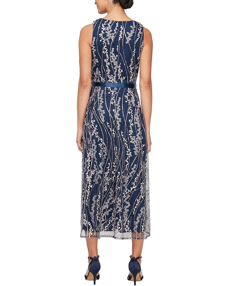 - Project a classy image with your outfit by styling the Alex Eveningsâ„¢ Midi Length Embroidered Dress, a captivating blend of sophistication and style. Gracefully crafted with intricate embroidery, its midi length and sleeveless design exude timeless charm. The satin tie belt cinches the waist, ensuring a flattering silhouette. Effortless glamor meets easy wear with a convenient back zipper. Tea-length perfection awaits.