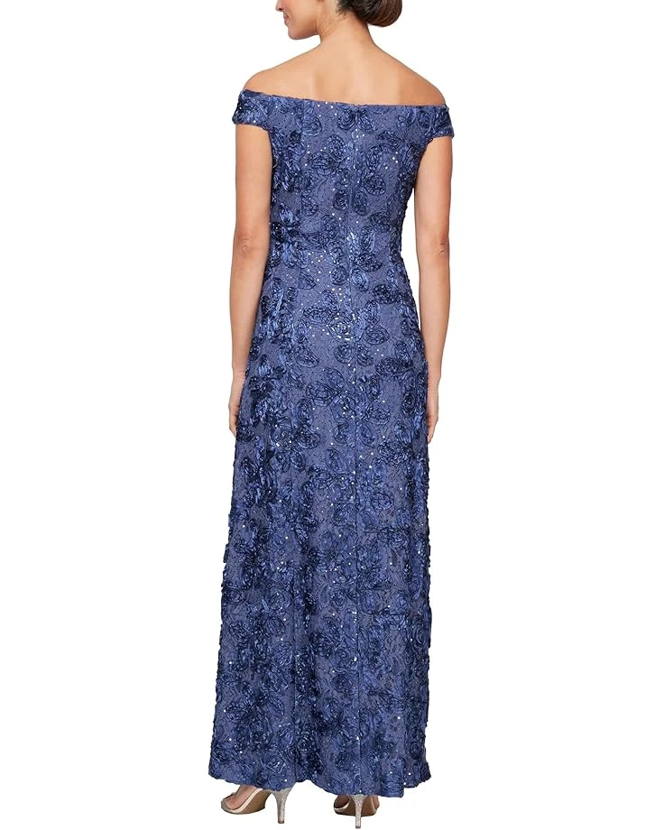 - Exude sophistication through clothing by styling the Alex Evenings™ Off-the-Shoulder Long Rosette Lace A-Line Dress−an enchanting dance of lace whispers and off-the-shoulder allure. Embrace timeless sophistication with its rosette lace and A-line grace. The back zipper ensures a seamless fit.