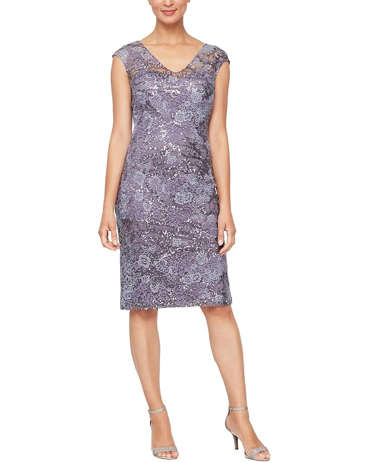- Look alluring wearing the Alex Eveningsâ„¢ Short Embroidered Sheath Dress with Cap Sleeves and V-Neckline and enjoy the day.